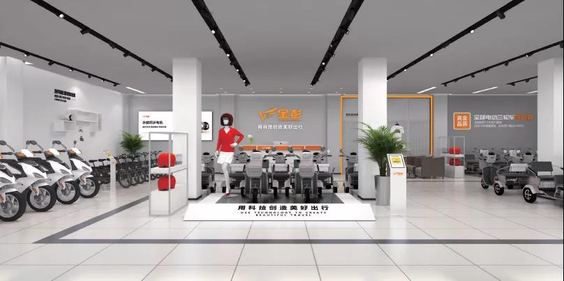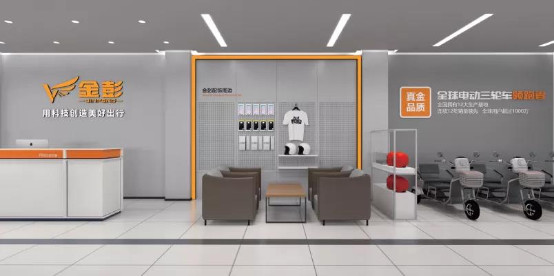 采用分級式門頭展現:1級門頭是醒目的Logo,能夠讓用戶直觀地認知到金彭的品牌;2級門頭“用科技創造美好出行”傳遞金彭長久以來堅持的面向用戶的企業使命;3級門頭“經營品類”提供更明了的銷售品類信息。同時整體采用通透的櫥窗設計,可以一覽店內空間。