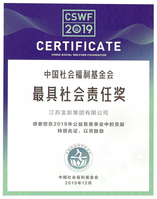 再獲殊榮!金彭獲評中國社會福利基金會2019年度“最具社會責任”獎
