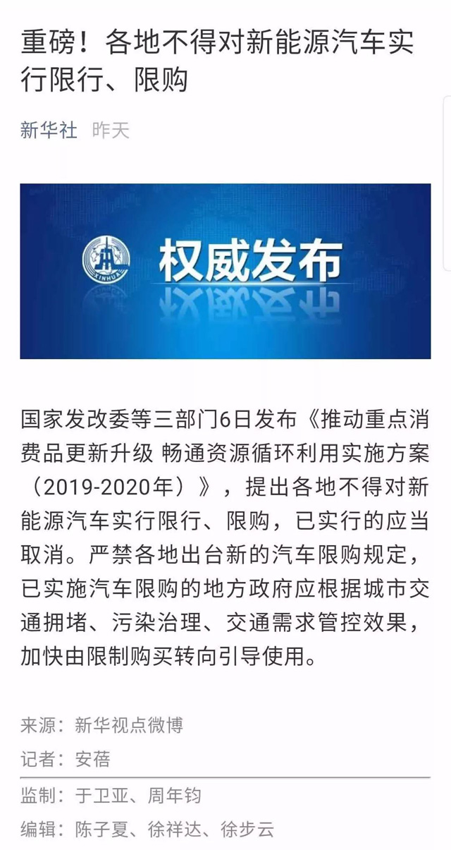 新華社權威發布!各地不得對新能源汽車實行限行、限購