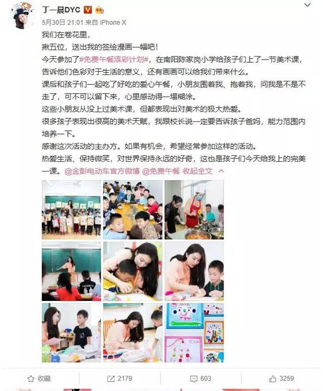 陳家崗小學(xué)的六一“歡樂(lè)課堂”從一節(jié)創(chuàng)意手工課開(kāi)始。知名漫畫(huà)家丁一晨與兩位志愿者一起,給孩子帶來(lái)各式各樣的手工材料,在老師的指導(dǎo)下,孩子們天馬行空的想象力和動(dòng)手能力被激發(fā),眼花繚亂的材料立刻變成了一幅幅精致的作品呈現(xiàn)在大家面前。“孩子們的創(chuàng)造力很強(qiáng),在這個(gè)過(guò)程中,他們展現(xiàn)出的互助、分享和純真等美好品質(zhì)也讓我受益良多。”課間,丁一晨將學(xué)生們上課的情景繪制成了漫畫(huà),用畫(huà)筆記錄充滿(mǎn)童趣的一課。活動(dòng)結(jié)束后,丁一晨將孩子們的作品發(fā)布在微博上,單條轉(zhuǎn)發(fā)超2000,評(píng)論超600,引起網(wǎng)友熱烈討論。